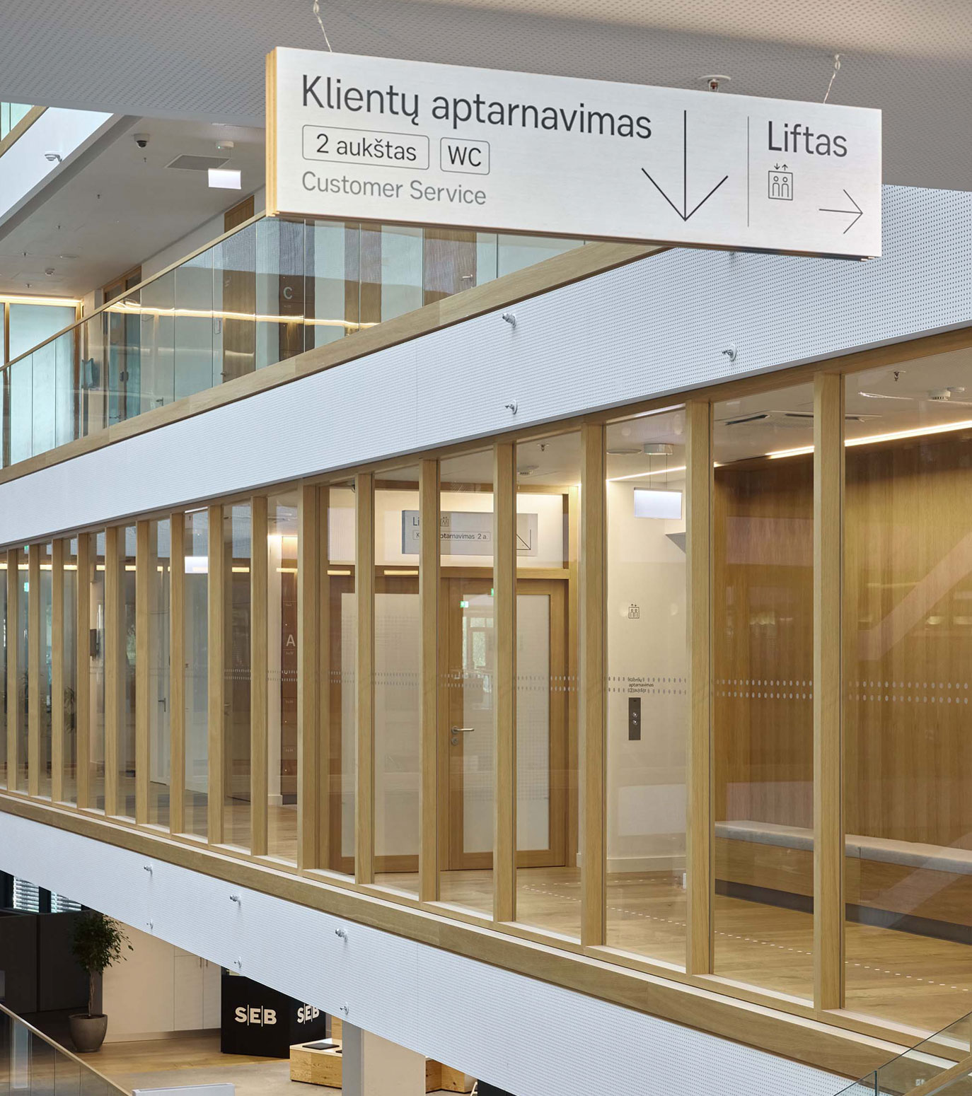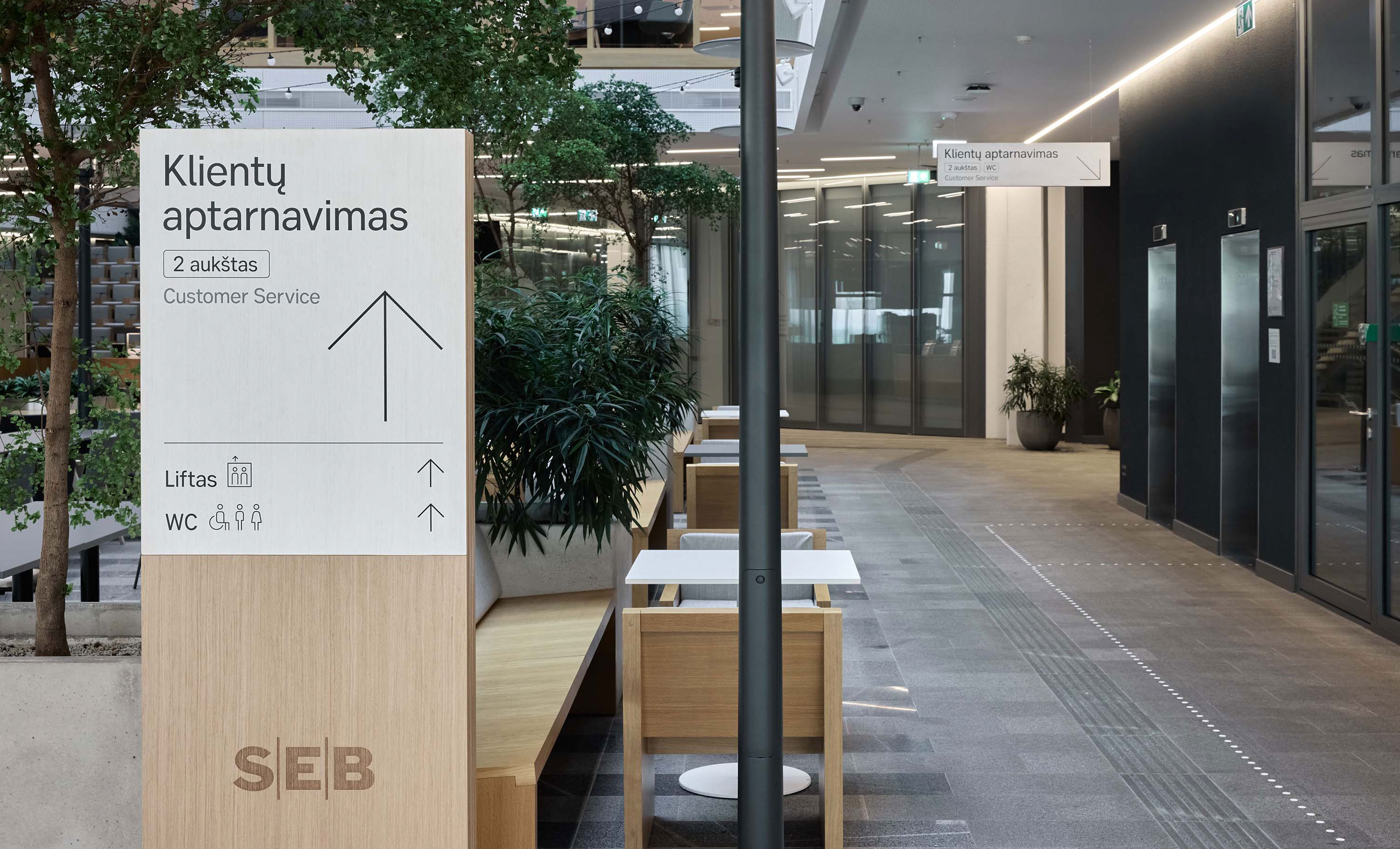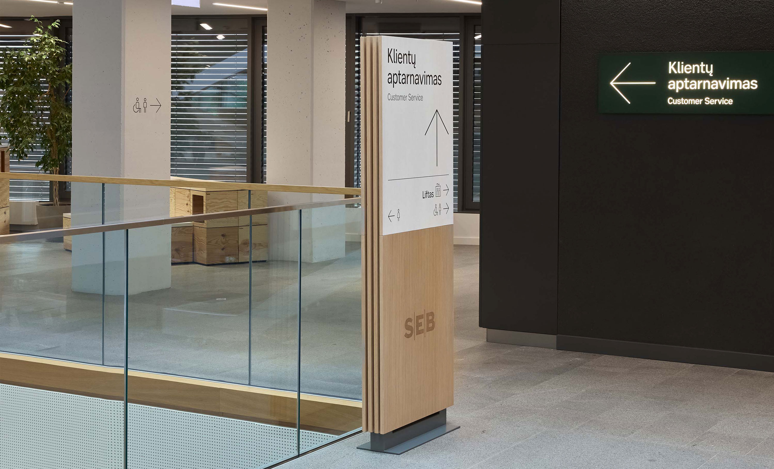 SEB Bank required a navigation system for their customer service department that was already operational. The original fit-out had not accounted for wayfinding, resulting in customer confusion and inefficient space utilization. Installing navigation in a functioning facility presented several challenges. Operations could not be disrupted, and the existing architectural layout imposed significant limitations. The solution had to work within these fixed parameters while managing complex customer flows effectively.