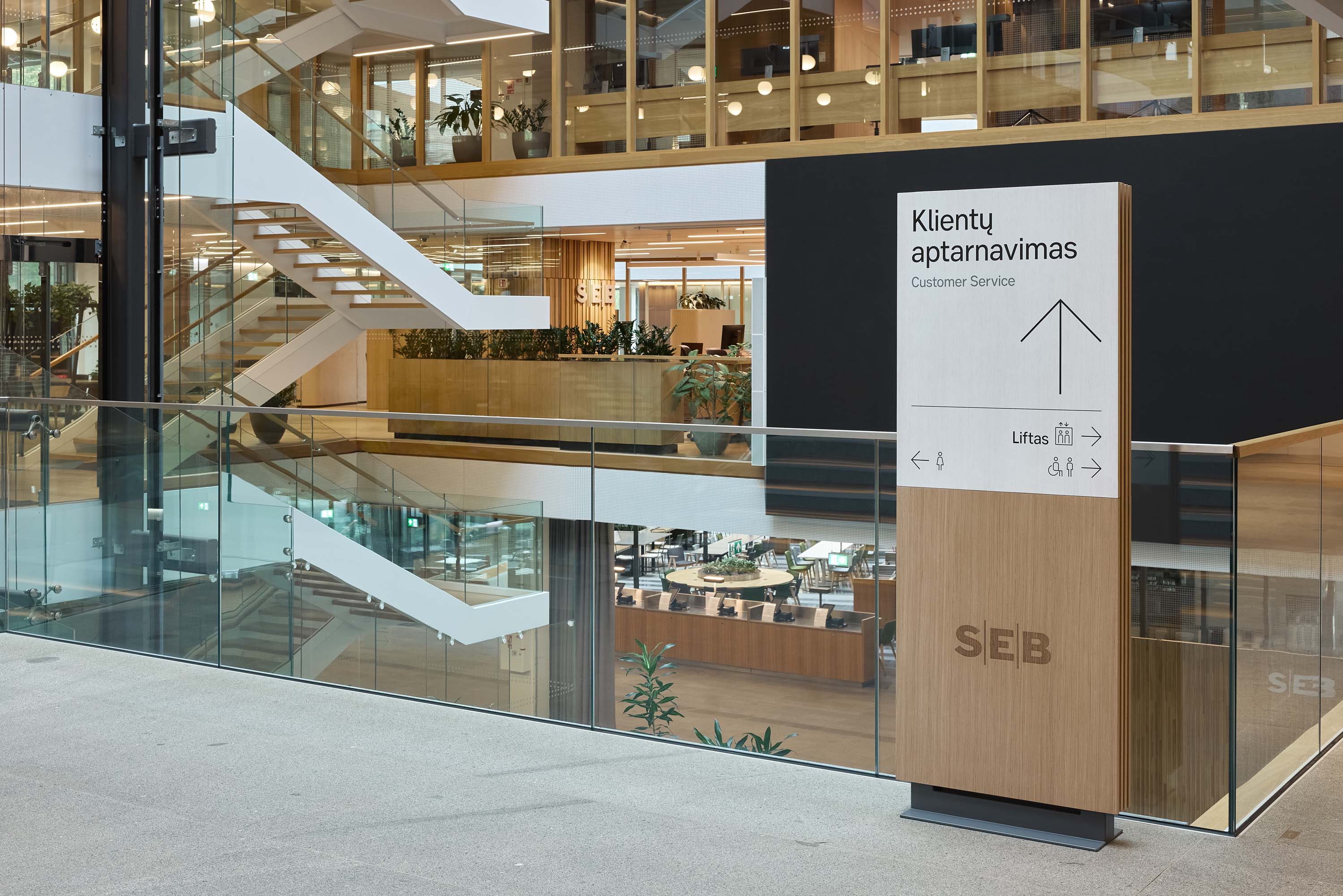 We developed a modular signage system that integrated into the existing infrastructure without requiring structural modifications. Rather than treating navigation as a separate element, we embedded SEB's brand identity directly into the wayfinding components. This dual-purpose approach created functional navigation while reinforcing brand consistency throughout the space. The solution utilized high-grade materials designed for high-traffic commercial environments while maintaining SEB's premium positioning. The navigation system delivered measurable improvements in operational efficiency by reducing customer confusion and decreasing staff time spent on directions.