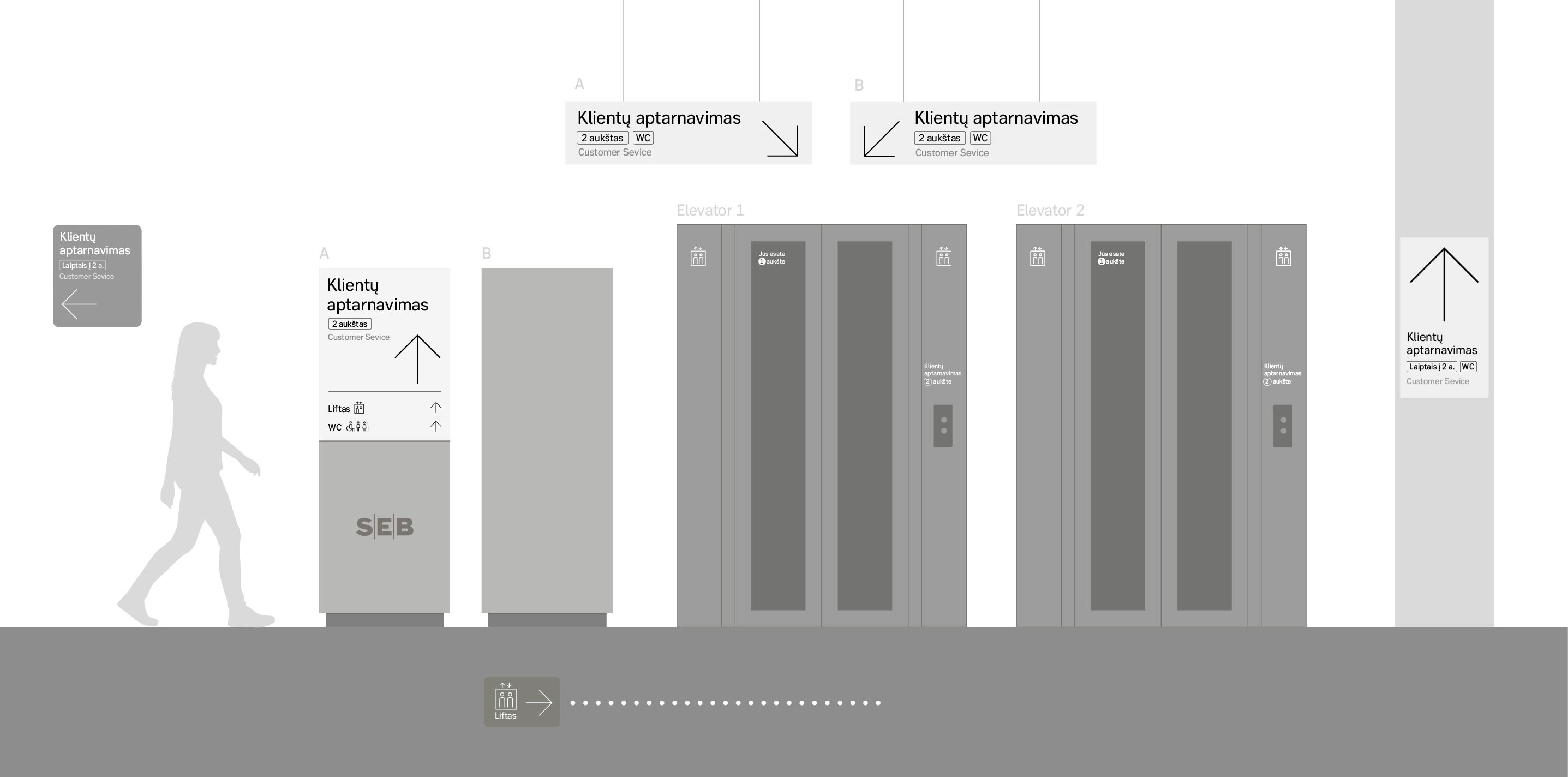SEB Bank required a navigation system for their customer service department that was already operational. The original fit-out had not accounted for wayfinding, resulting in customer confusion and inefficient space utilization. Installing navigation in a functioning facility presented several challenges. Operations could not be disrupted, and the existing architectural layout imposed significant limitations. The solution had to work within these fixed parameters while managing complex customer flows effectively.